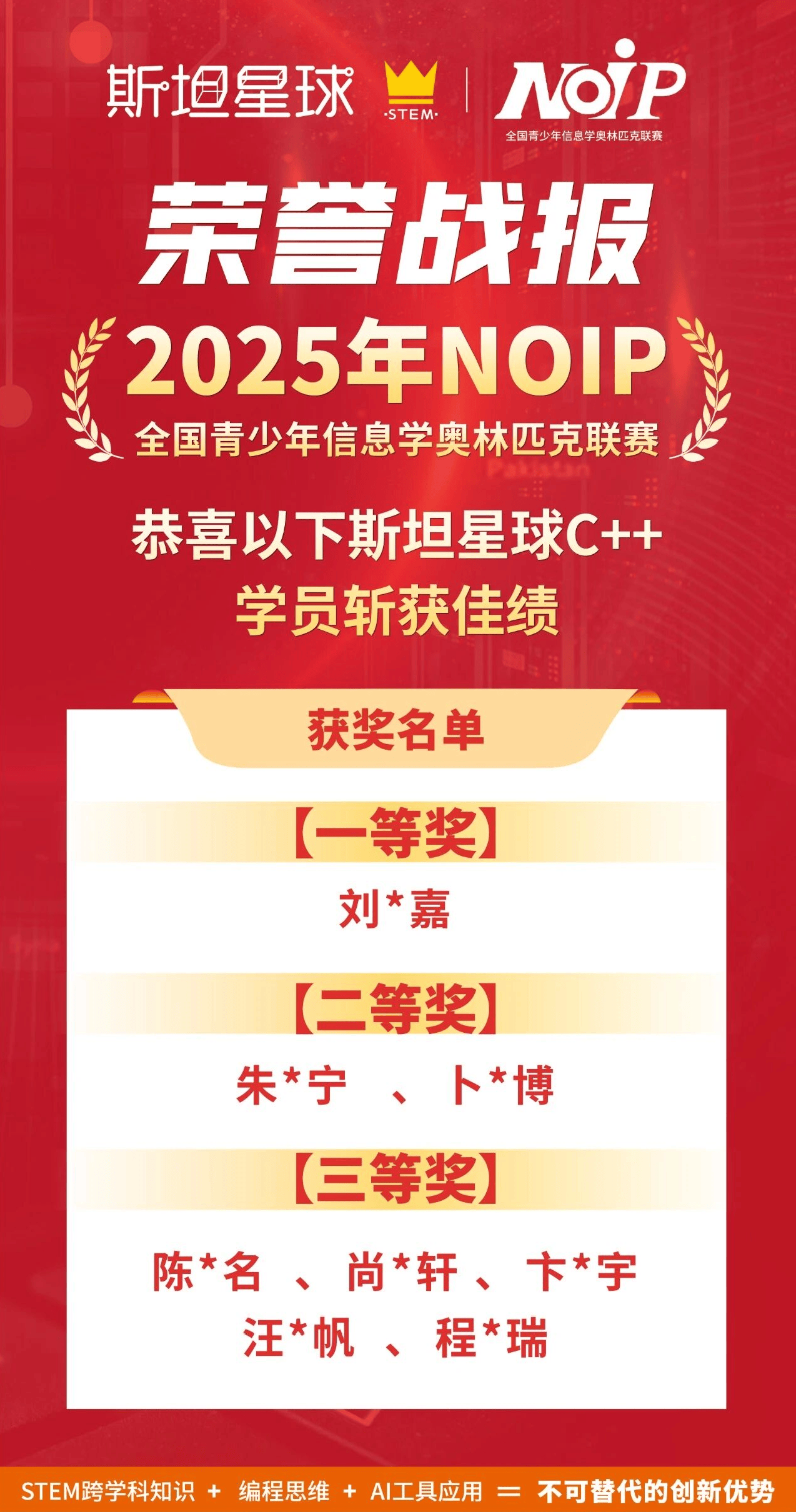 斯坦星球8名C++学员凭借过硬实力斩获佳绩,一等奖1名、二等奖2名、三等奖5名。