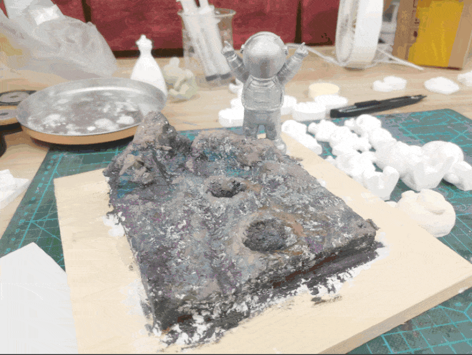 实验室提供3D打印模型、木板、泡沫板、石膏粉、热熔胶枪、丙烯颜料、一次性杯子、搅拌棒、喷漆等材料。