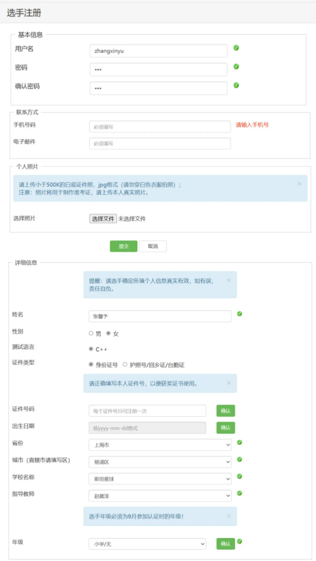 6. 个人信息修改 :用户名和证件号信息一经注册,将不能更改。如证件信息有误,请务必重新注册。个人信息(姓名、性别、语言、省份、城区、学校、指导教师和年级)在报名正在进行的活动后锁定,不再允许更改。如需修改个人信息,请在报名前完成修改。