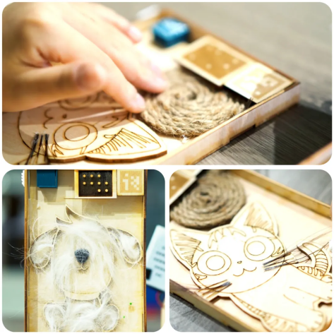 嗅觉上:她制作了不同味道的香精棉放置在味道盒中,当打开味道盒时就能闻到对应的气味;