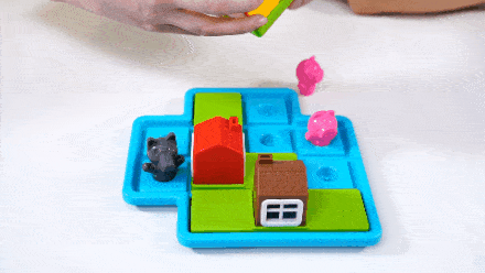 【三只小猪】的特别之处在于游戏和故事绘本的结合。在探索摆放小猪、大灰狼、房屋位置过程中,逐步培养孩子的空间感知能力,而故事绘本的演绎则有效锻炼孩子的语言表达能力。