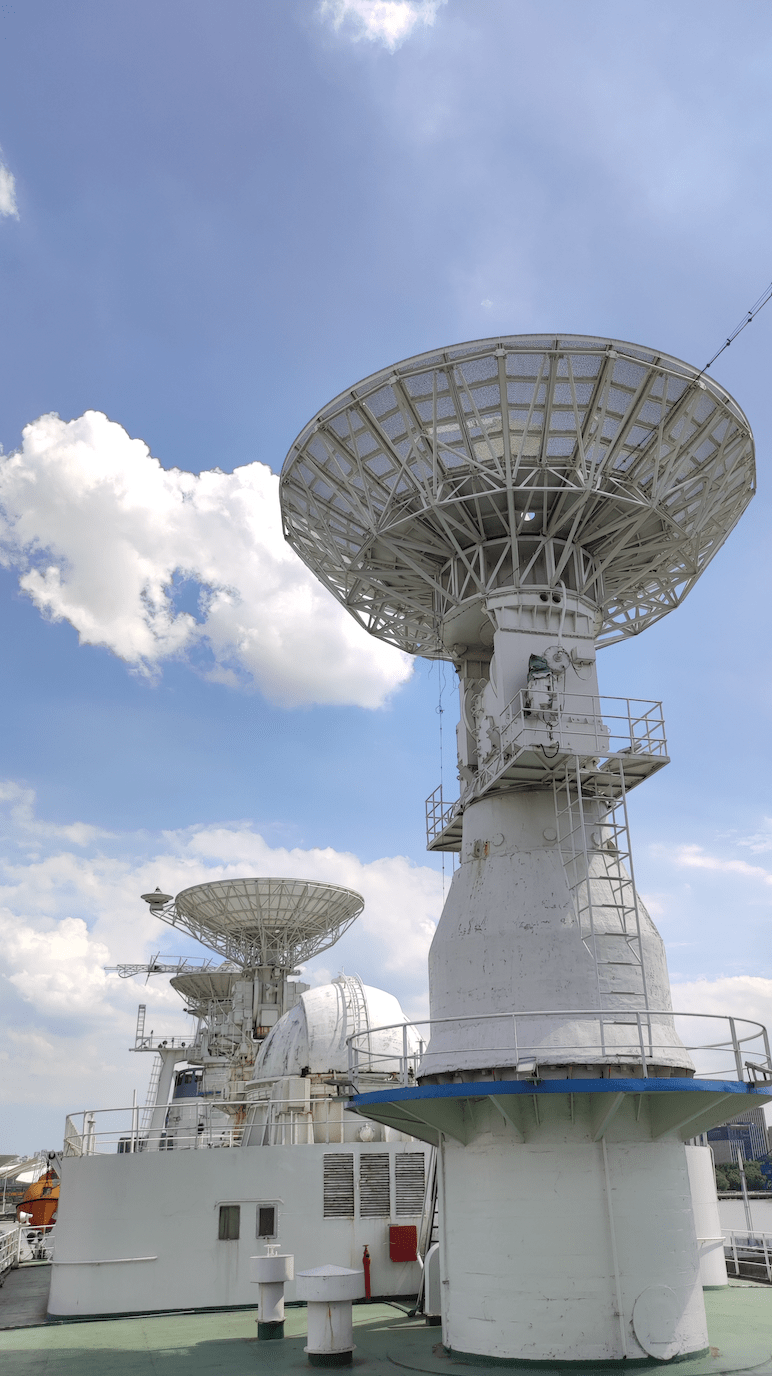 测量船是航天测控网中的重要组成部分。与陆地测量站相比,测量船可在广阔的大洋上灵活选点布站、机动应急测控。测量船既是“千里眼”,又是“风筝线”,因为它不仅能够测量飞行器轨道,也能够发送控制指令,遥控卫星进行变轨、姿态调整、太阳能帆板展开等动作。