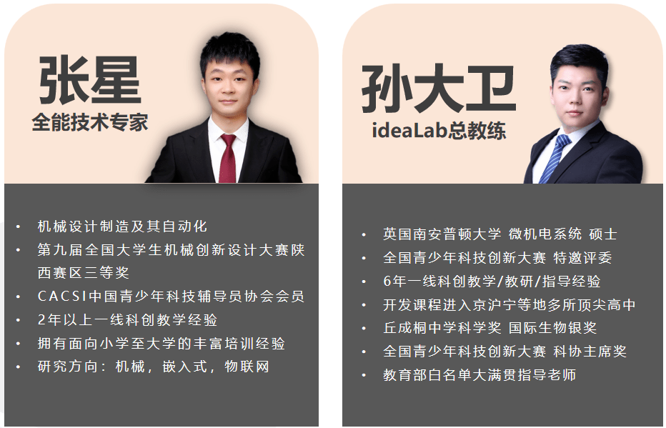 孙大卫老师毕业于英国南安普顿大学微机电系统,理工科背景还有6年的一线科创教学教研指导经验,助力学生斩获了众多高含金量奖项。