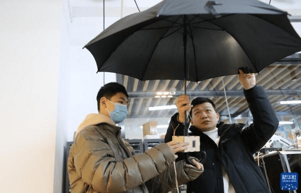 宋元坤(左)和辅导老师一起调试他制作的带照明和发送呼救信息功能的雨伞