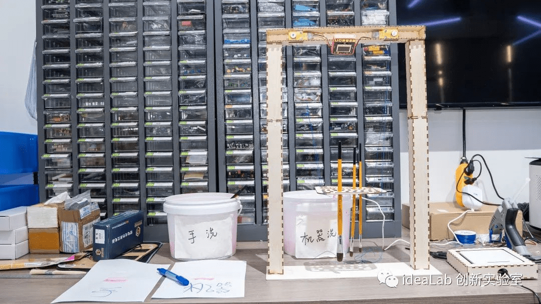 蔡同学一开始做的笔刷清洗机不大,但是他后面就想到,如果做一个大型的洗笔机呢?甚至想把这个东西放在教室里面,以后大家学完了之后,小朋友们一起用。