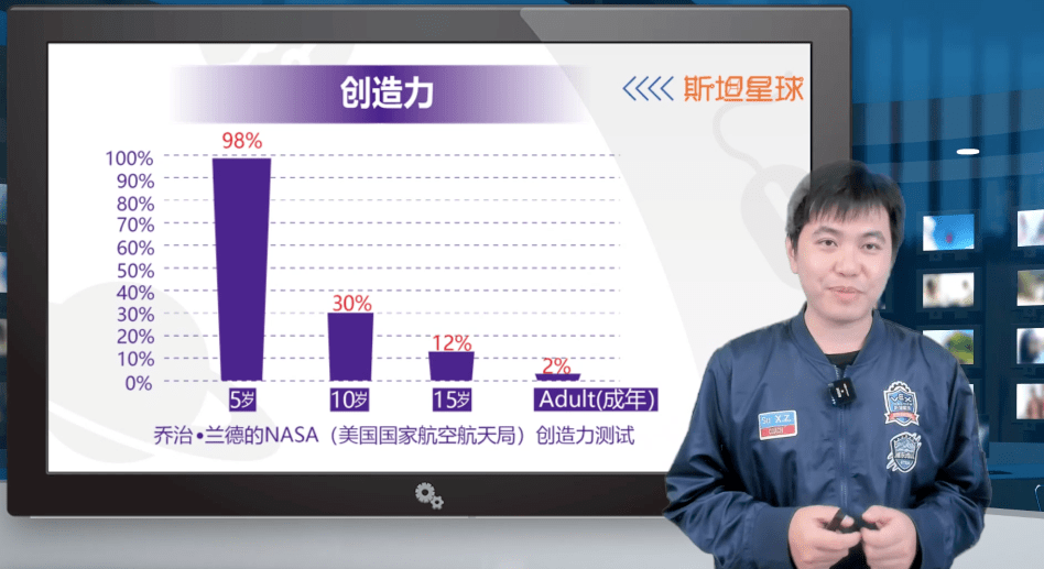 四项核心技能中,苏行洲老师在分享会上格外强调了创造力这一项。根据乔治·兰德的NASA创造力测试所示,创造力随年龄不断减弱,较成年人而言,5~10岁儿童拥有更多创造力。斯坦星球希望根据科学规律,在最佳时间培养孩子的思维方式与学习能力,激发、并充分发挥其创造力。