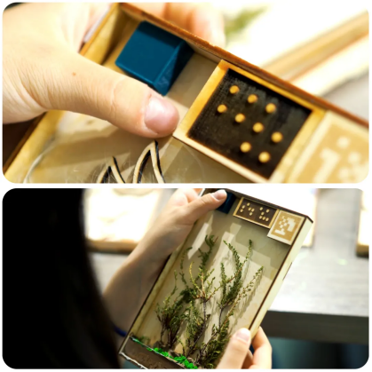 嗅觉上:她制作了不同味道的香精棉放置在味道盒中,当打开味道盒时就能闻到对应的气味;
