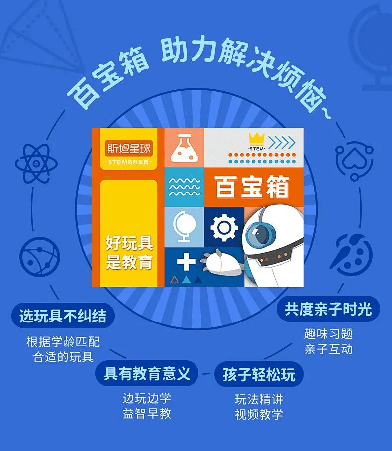 以此为出发点,在他的带领下斯坦星球团队出门了一套科学又系统化的STEM教玩具——“百宝箱”!作为STEM教育的践行者,我们赋予玩具更多教育属性,立志将更多高品质的产品和教育服务带给学习中心尚不能覆盖的家庭,帮助孩子轻松快乐的接触STEM世界,让孩子保持好奇,热爱探索,更多绽放!