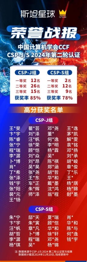此次斯坦星球学员在 CSP-J/S 2024 复赛中的优异表现,不仅为个人赢得了荣誉,也为学校和家长们提供了参考,未来期待更多星球少年在信息学领域展现才华,取得优异成绩。