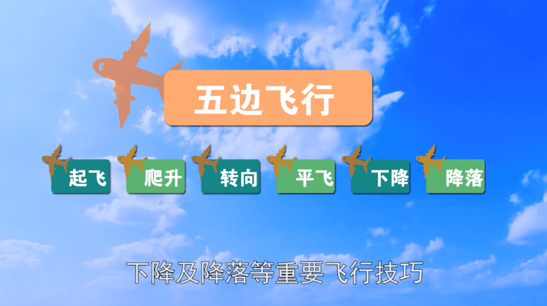 五边飞行也是训练飞行员的一项重要课程,飞行员可以从五边飞行中学习起飞、爬升、转向、平飞、下降及降落等重要飞行技巧。
