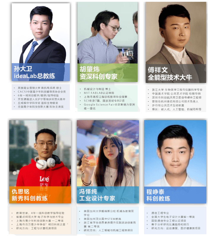ideaLab金牌教练团担任营地导师,他们中有资深科创专家,有全能型技术大牛,有工业设计专家……给予学生多领域的学习和交流,多方面的培养综合素养和创造能力。