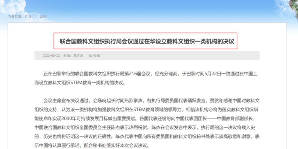 5月22日,联合国教科文组织执行局第216届会议一致通过在中国上海设立教科文组织STEM教育一类机构的决议。