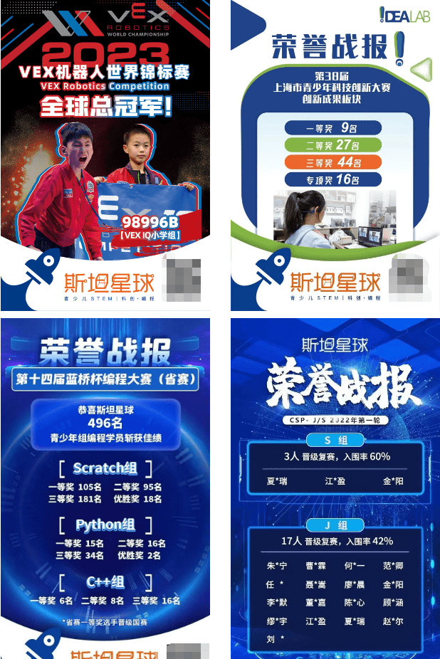 凭借强大的科研实力和师资团队,斯坦星球斩获了国内外众多编程、科创赛事的荣誉奖项,比如信奥、青创赛和VEX等高含金量赛事的冠亚军、一等奖等,优秀学员也代表中国参加世锦赛,积累了众多获奖经验!