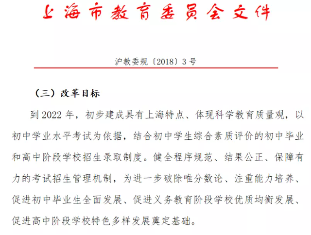2018年,上海市教委会发布《上海市进一步推进高中阶段学校考试招生制度改革实施意见》,改革目标指出:
