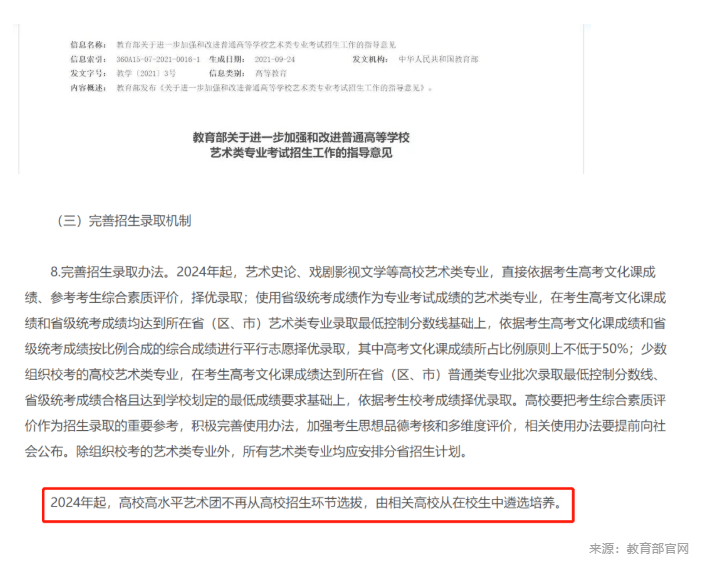2021年,教育部印发了《关于进一步加强和改进普通高等学校艺术类专业考试招生工作的指导意见》,在其中规范了艺术类专业的招生政策,这意味着艺术特长生的升学之路,迎来重大变革。