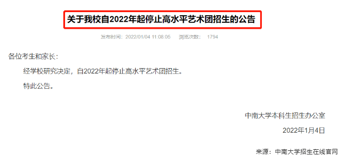 近几年,已有中山大学、中国政法大学、中国农业大学等10多所高校宣布停止高水平艺术团招生,结合2021年9月教育部的发文要求,此次部分高校停止艺术特长类招生,正是对相关政策的贯彻落实。
