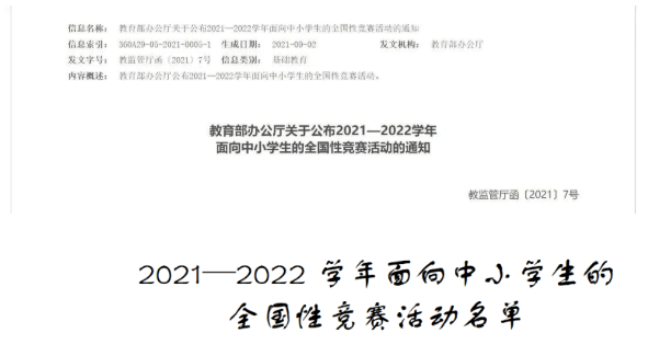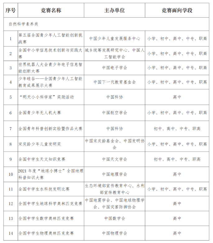 去年9月,教育部公布2021—2022学年面向中小学生的全国性竞赛活动,其中有20项都是自然科学素养类活动,主办单位虽不同,但赛事名次的含金量都是很高的。