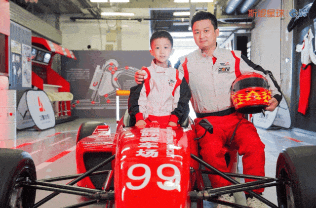 在赛车场的车库内,爸爸和孩子们纷纷换上了F1赛车服,摆出各种pose,一起过足了专业赛车手的瘾!