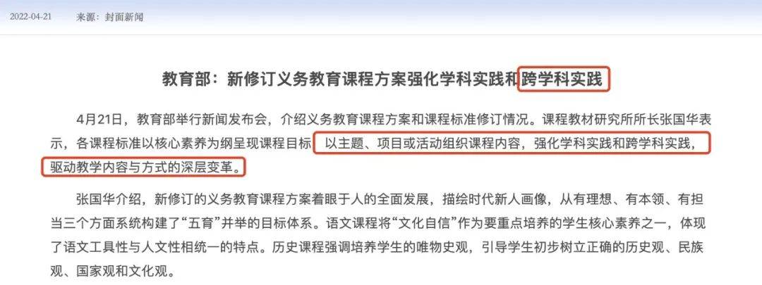 在教育bu制定的《义务教育课程方案和课程标准(2022年版)》当中,跨学科这个词出现频率高达400多次,其重要程度可见一斑。