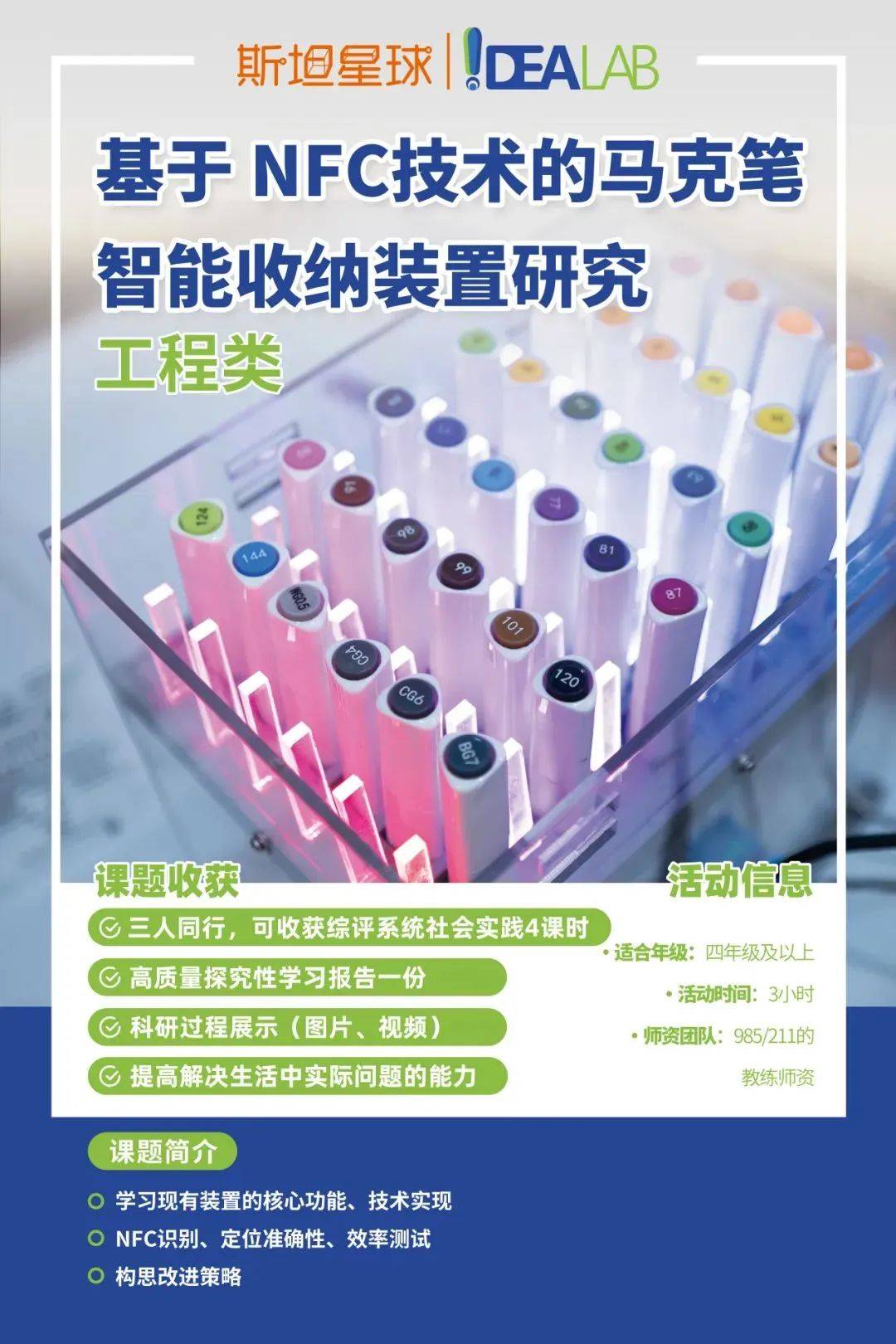 例如工程类项目“基于NFC技术的马克笔智能收纳装置研究”,就是一个典型的跨学科的探究学习项目。