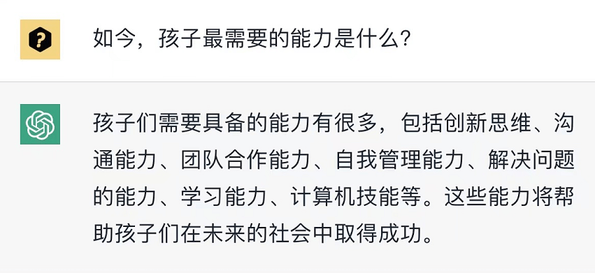 比如,你问ChatGPT“如今孩子最需要的能力是什么”?它会给出以下回复,听起来好像很有道理!