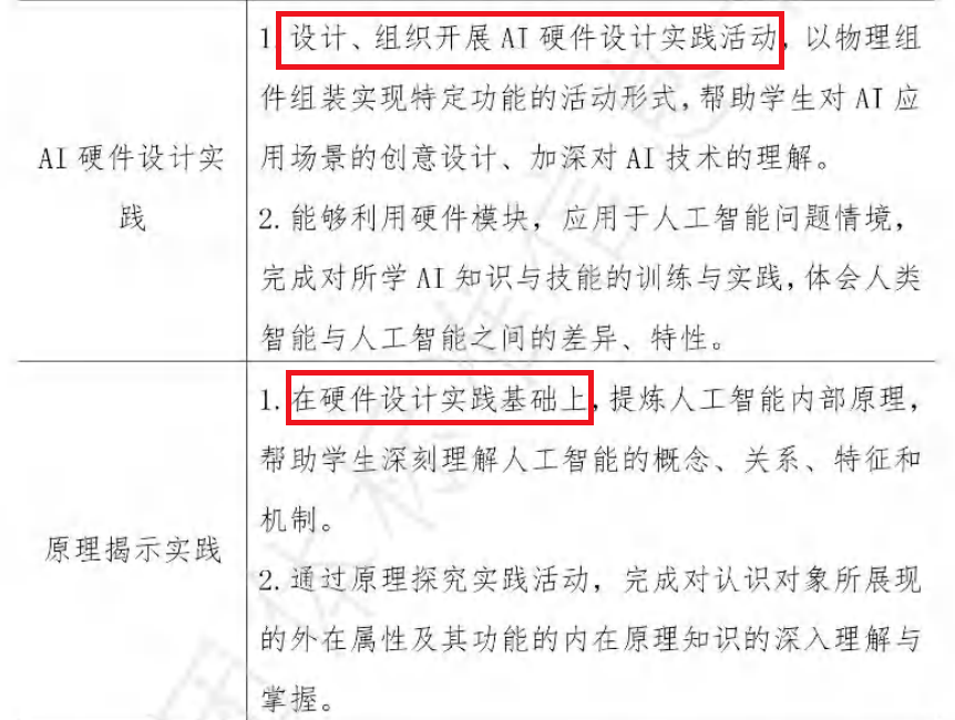 建议人工智能课程的核心实践类型,其中包含硬件设计实践
