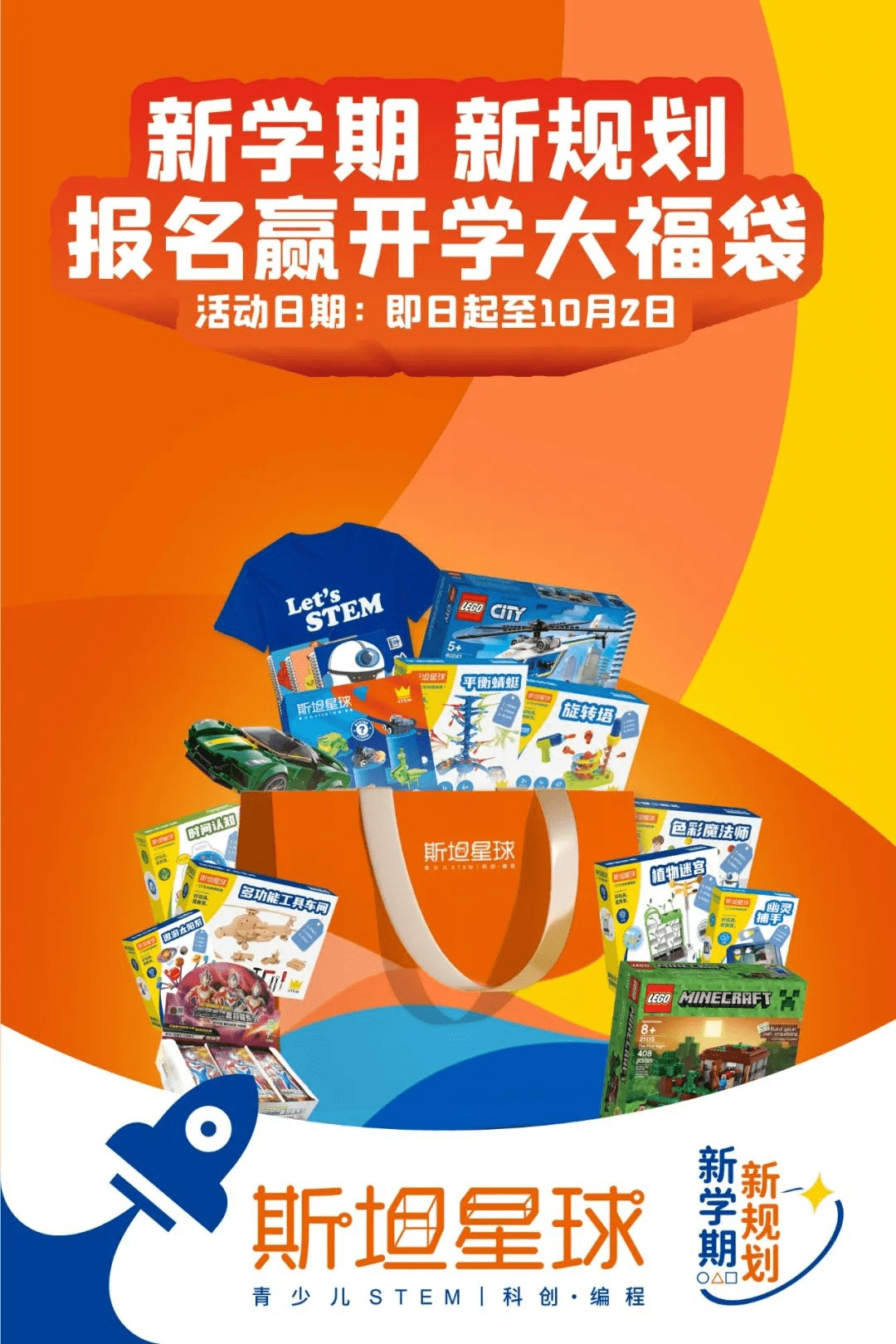 活动期间,报名斯坦星球指定课程,即可获赠开学大福袋1份,GET缤纷好课,还能体验开盲盒的乐趣,内含精品STEM科创玩具、斯坦星球定制T恤等(福袋中的礼品均为随机组搭配,可能会跟文中列出的有出入哦~)……