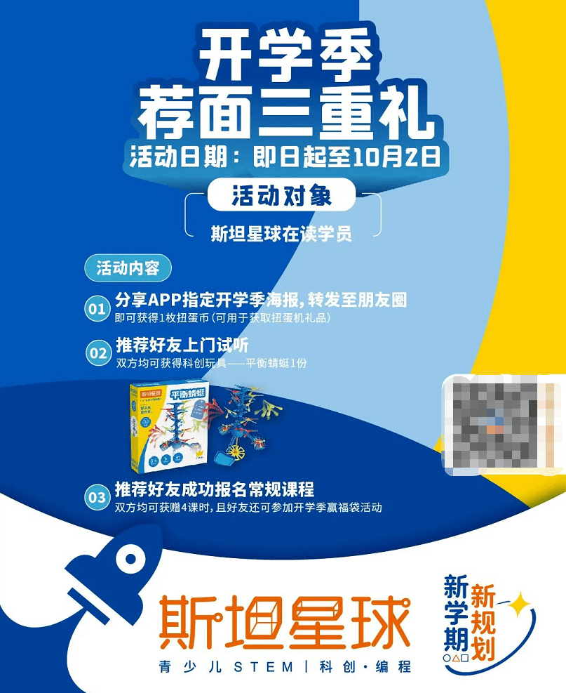 3. 斯坦星球会员推荐好友成功报名常规课,双方均可获赠4课时,且好友还可参加开学季赢福袋活动