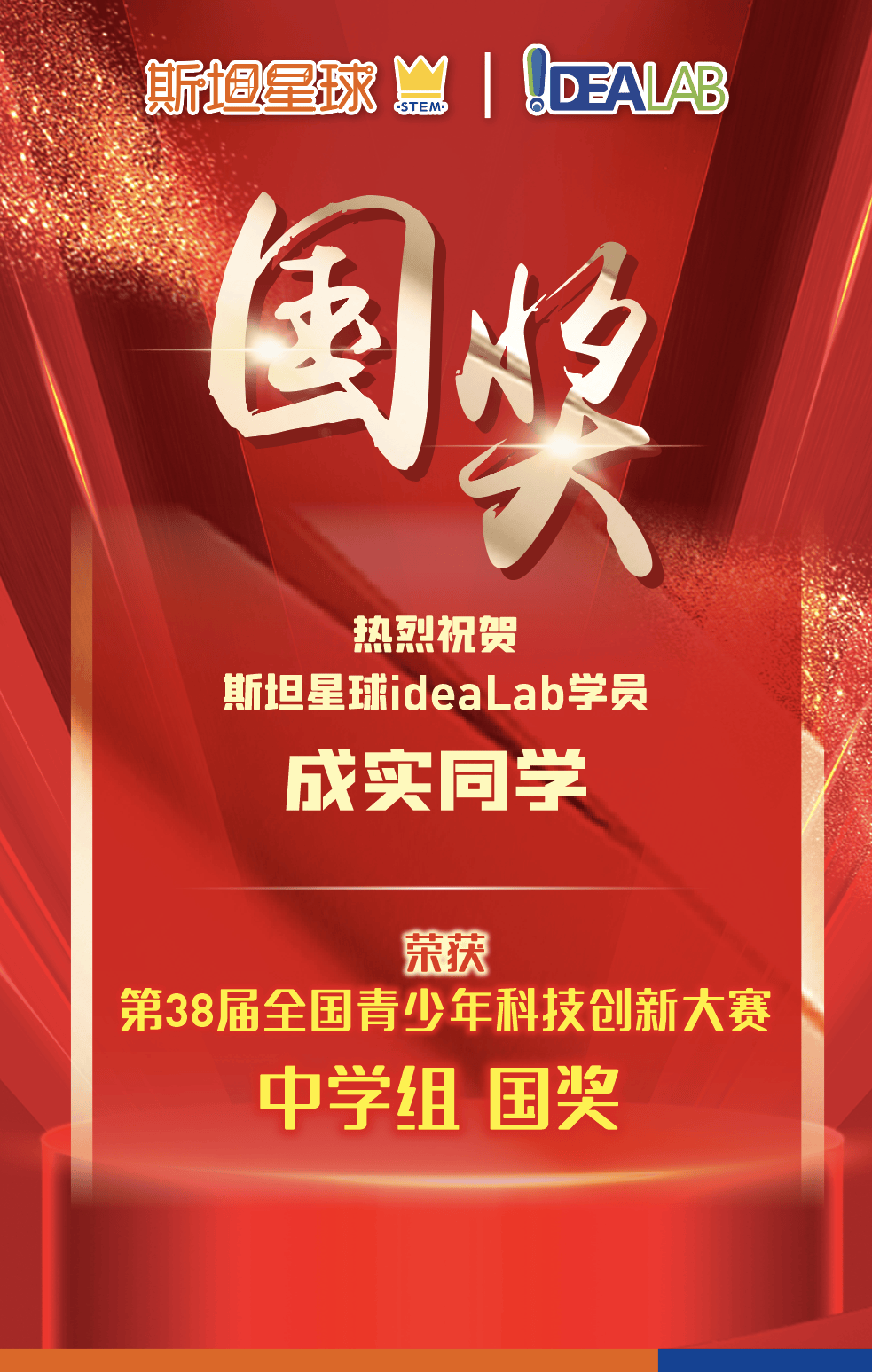 斯坦星球ideaLab学员成实同学在本次赛事中,荣获中学组国赛奖项!成同学通过层层选拔冲进国赛并获得奖项,不仅证明了成同学优秀的科创能力也证明了斯坦星球科创赛事的出色水平!